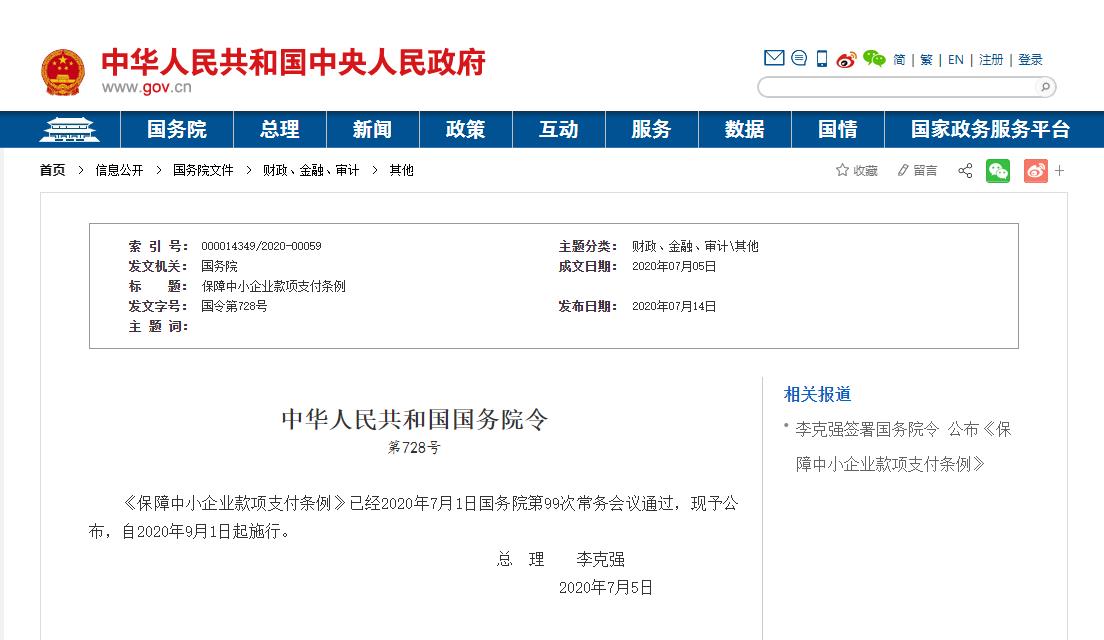 国务院公布保障中小企业款项支付条例,9月1日起施行